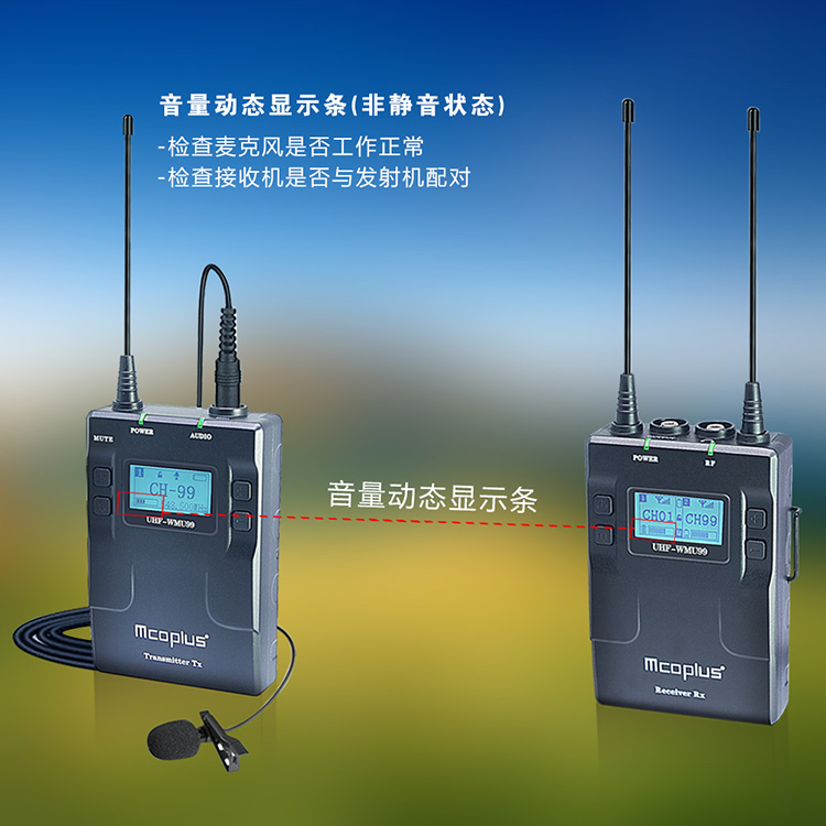 UHF-WMU99是一款全金属无线麦克风,一个接收器即可触发双发射器,内置聚合物锂电池,它利用UHF无线FM技术和高分辨率点阵屏幕,同时增强了RF信号并具有强大的屏蔽性抗噪性能,它是广播级的高品质麦克风。